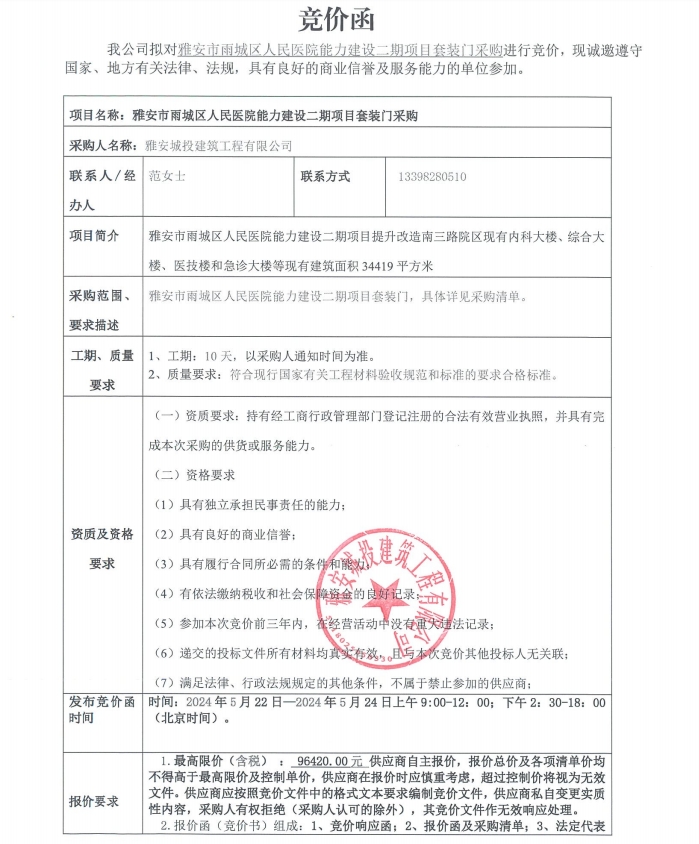 雅安市雨城區(qū)人民醫(yī)院能力建設(shè)二期項(xiàng)目套裝門采購競價(jià)公告