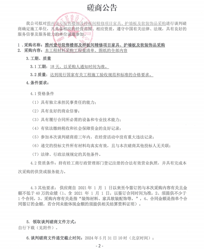 雅州壹號(hào)院售樓部及樣板間精修項(xiàng)目家具、護(hù)墻板及軟裝飾品采購(gòu)磋商公告