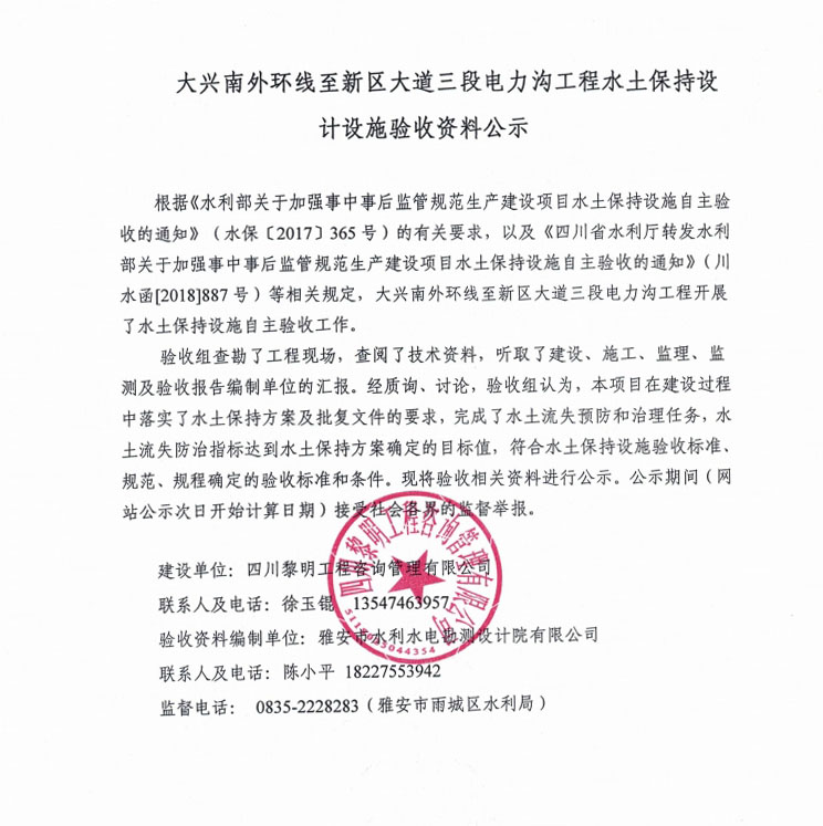 大興南外環(huán)線至新區(qū)大道三段電力溝工程水土保持設計設施驗收資料公示