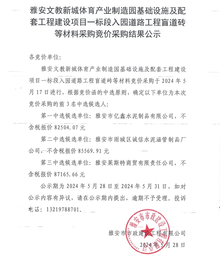 雅安文教新城體育產(chǎn)業(yè)制造園基礎(chǔ)設(shè)施及配套工程建設(shè)項(xiàng)目一標(biāo)段入園道路工程盲道磚等材料采購競價(jià)采購結(jié)果公示