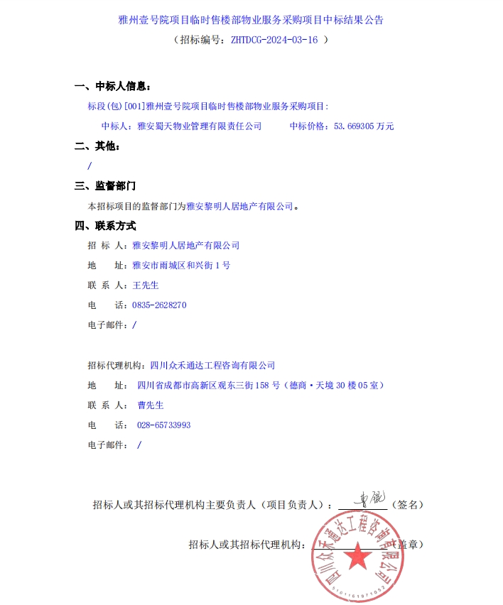 雅州壹號院項目臨時售樓部物業(yè)服務采購項目中標結(jié)果公告