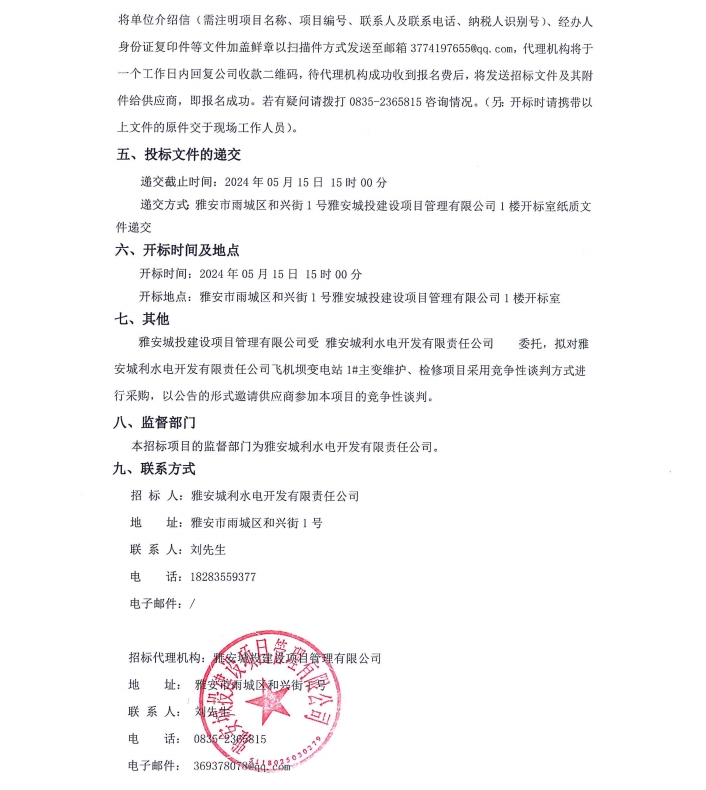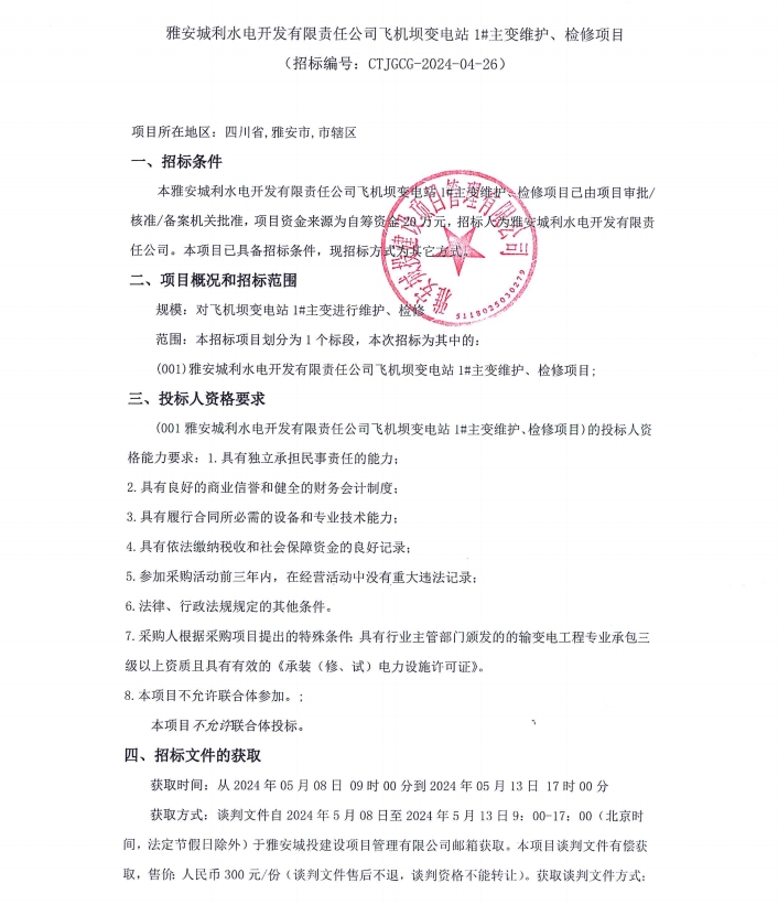 雅安城利水電開發(fā)有限責任公司飛機壩變電站1#主變維護、檢修項目公告