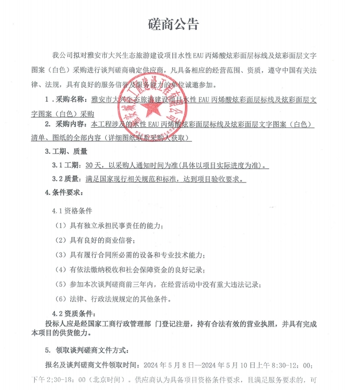 雅安市大興生態(tài)旅游建設(shè)項目水性EAU丙烯酸炫彩面層標(biāo)線及炫彩面層文字圖案(白色)采購磋商公告