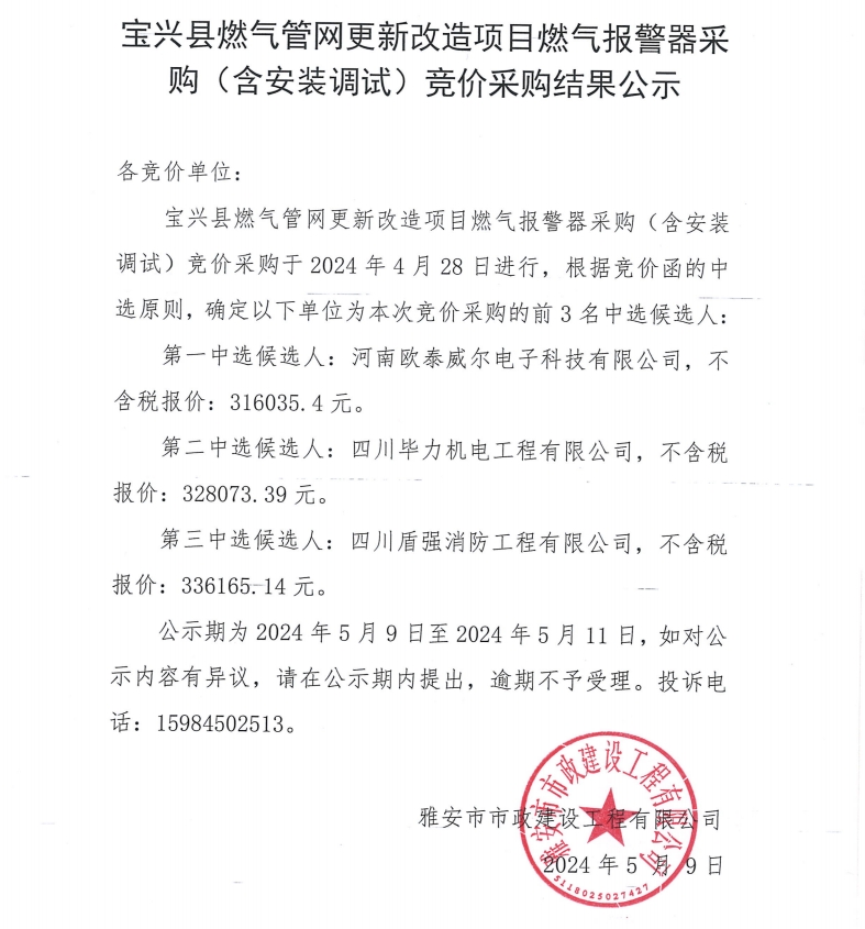 寶興縣燃?xì)夤芫W(wǎng)更新改造項(xiàng)目燃?xì)鈭?bào)警器采購(含安裝調(diào)試)競價(jià)采購結(jié)果公示