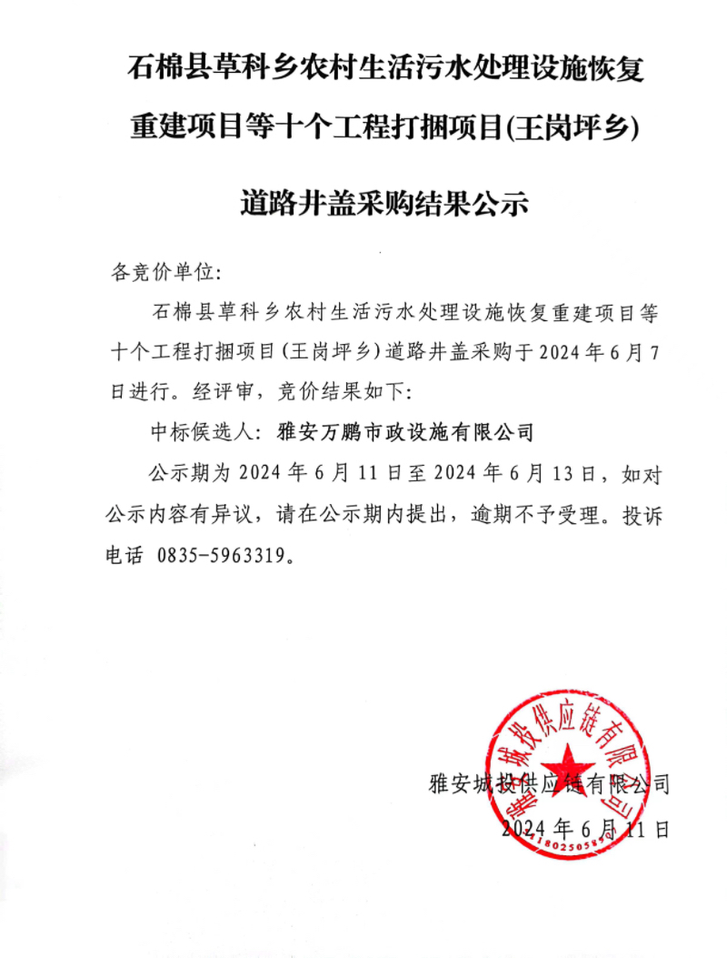 石棉縣草科鄉(xiāng)農(nóng)村生活污水處理設(shè)施恢復(fù)重建項(xiàng)目等十個(gè)工程打捆項(xiàng)目(王崗坪鄉(xiāng))道路井蓋采購(gòu)結(jié)果公示