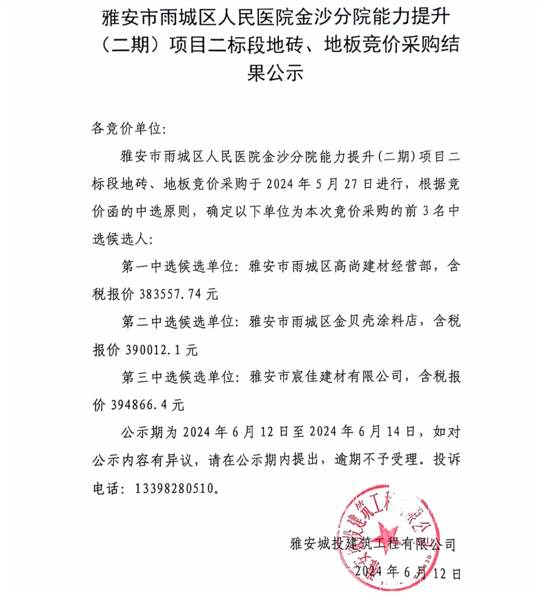 雅安市雨城區(qū)人民醫(yī)院金沙分院能力提升(二期)項目二標段地磚、地板競價采購結果公示