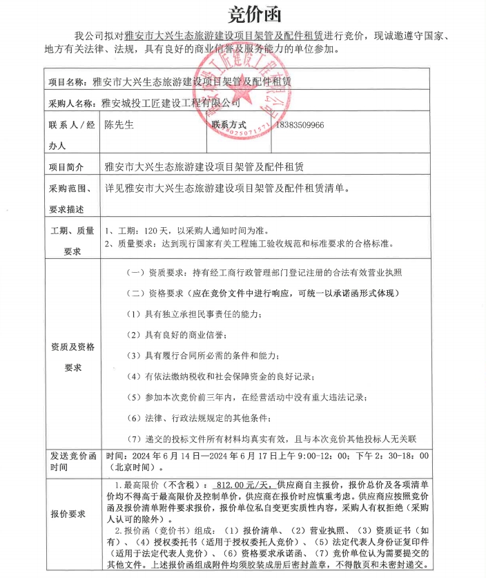 雅安市大興生態(tài)旅游建設(shè)項目架管及配件租賃競價公告