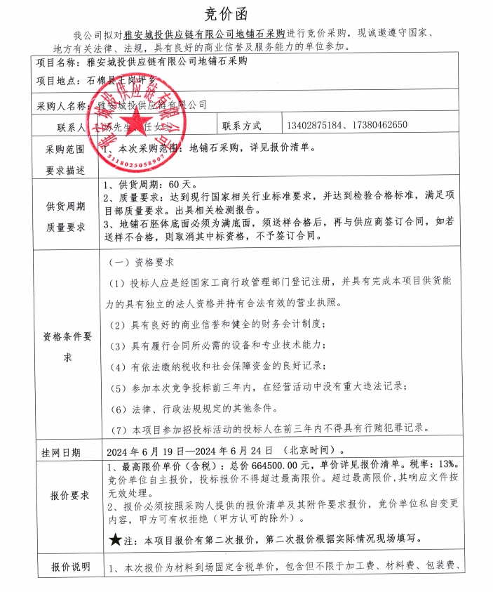 雅安城投供應(yīng)鏈有限公司地鋪石采購競價(jià)公告
