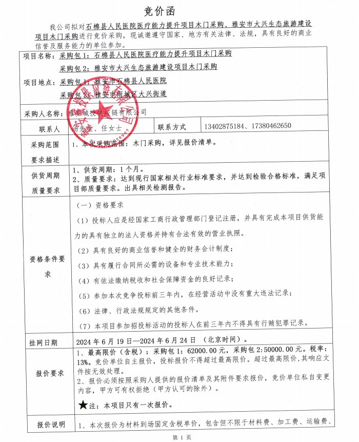 石棉縣人民醫(yī)院醫(yī)療能力提升項(xiàng)目木門采購(gòu)、雅安市大興生態(tài)旅游建設(shè)項(xiàng)目木門采購(gòu)競(jìng)價(jià)公告