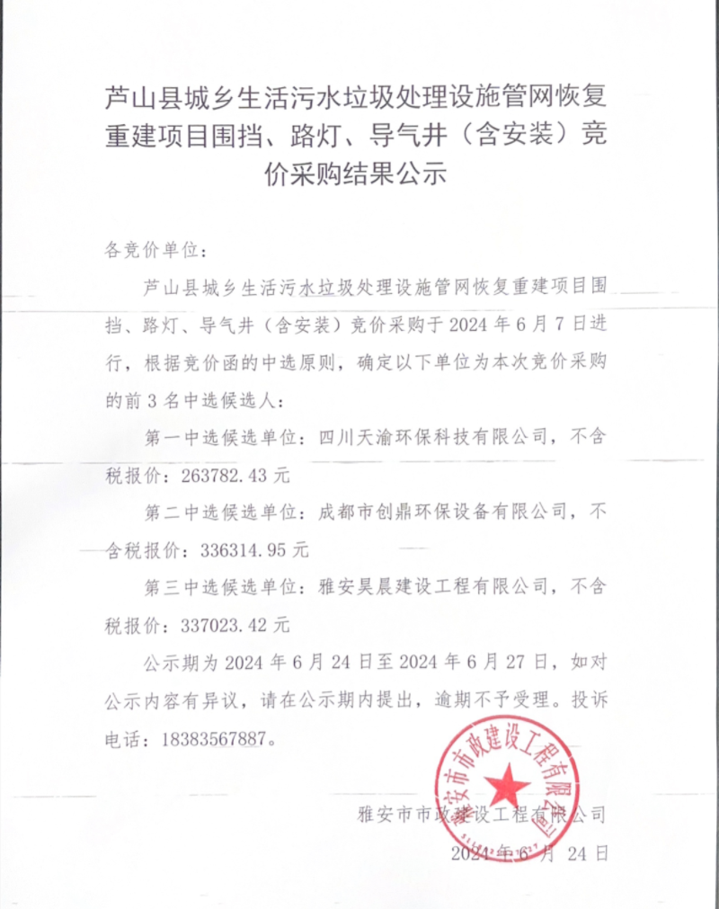 蘆山縣城鄉(xiāng)生活污水垃圾處理設施管網(wǎng)恢復重建項目圍擋、路燈、導氣井(含安裝)競價采購結果公示