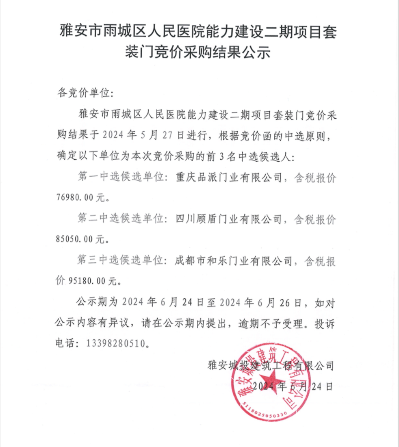 雅安市雨城區(qū)人民醫(yī)院能力建設(shè)二期項(xiàng)目套裝門(mén)競(jìng)價(jià)采購(gòu)結(jié)果公示