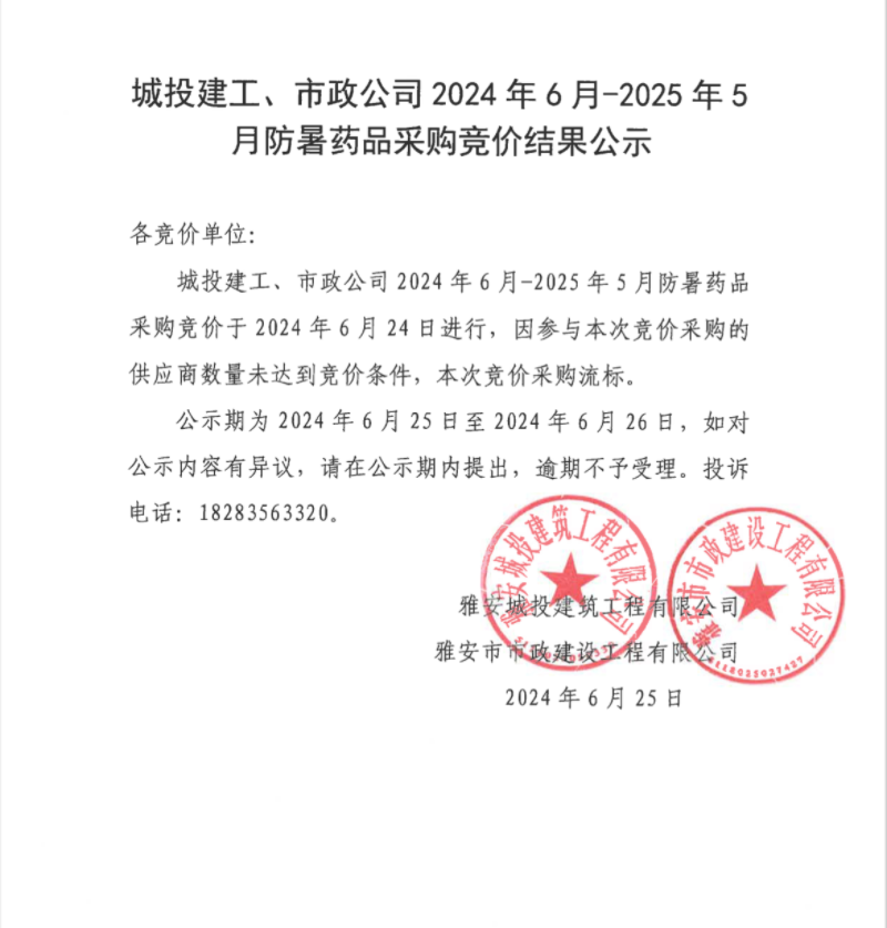 城投建工、市政公司2024年6月-2025年5月防暑藥品采購競(jìng)價(jià)結(jié)果公示