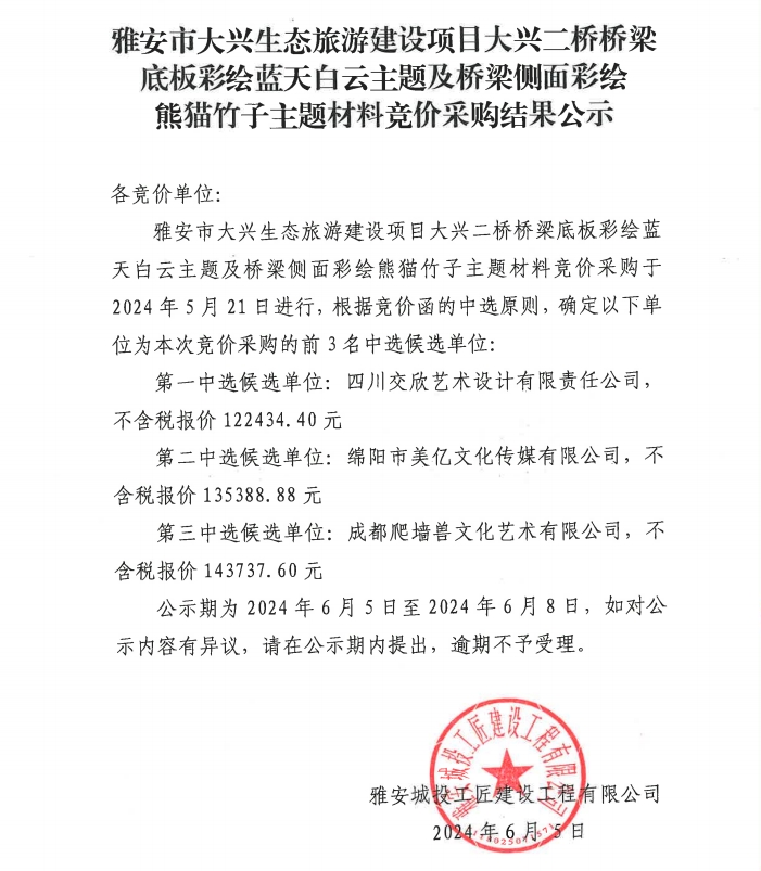 雅安市大興生態(tài)旅游建設(shè)項(xiàng)目大興二橋橋梁底板彩繪藍(lán)天白云主題及橋梁側(cè)面彩繪熊貓竹子主題材料采購結(jié)果公示