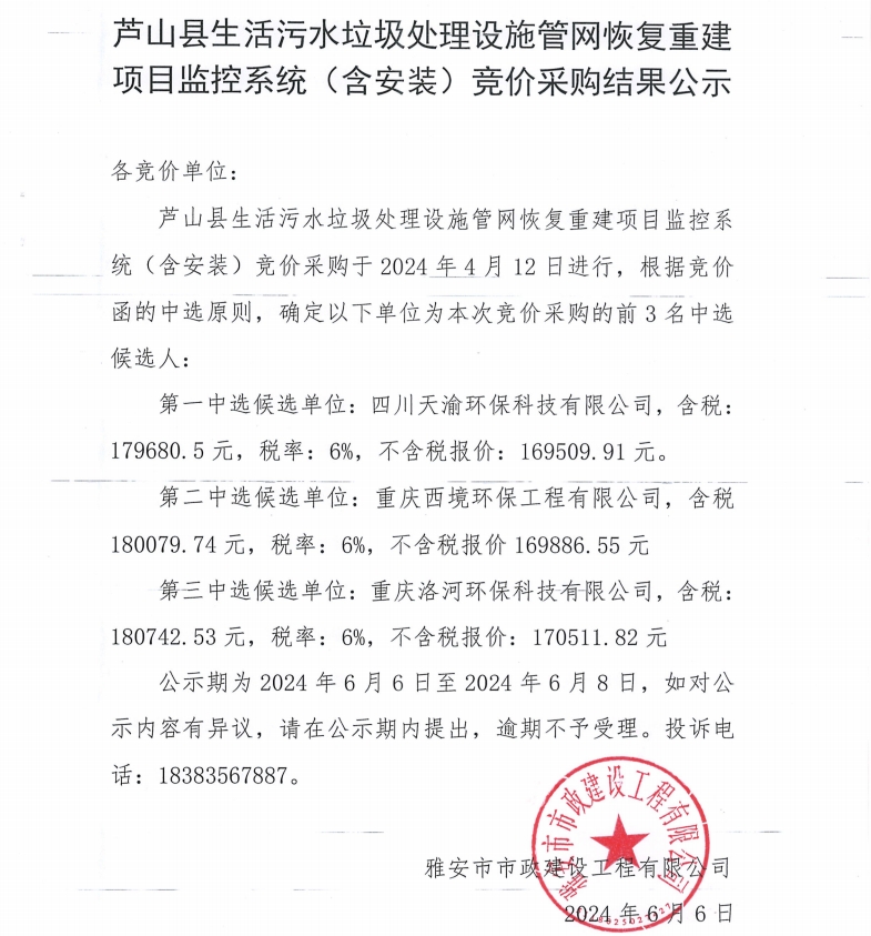 蘆山縣生活污水垃圾處理設(shè)施管網(wǎng)恢復(fù)重建項目監(jiān)控系統(tǒng)(含安裝)競價采購結(jié)果公示