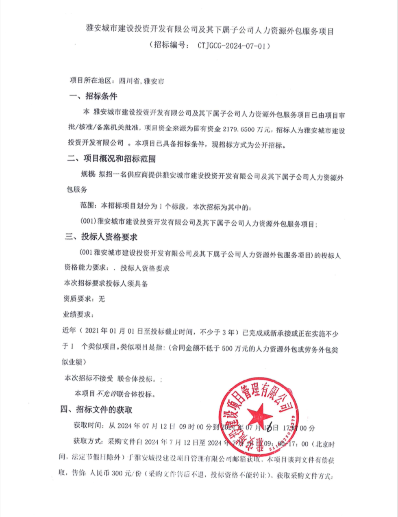 雅安城市建設投資開發(fā)有限公司及其下屬子公司人力資源外包服務項目公告