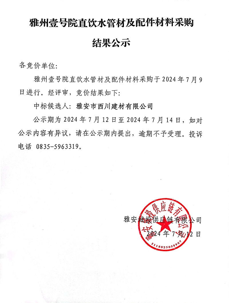 雅州壹號院直飲水管材及配件材料采購結果公示