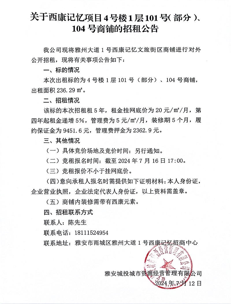關(guān)于西康記憶項目4號樓1層101號(部分)、104號商鋪的招租公告