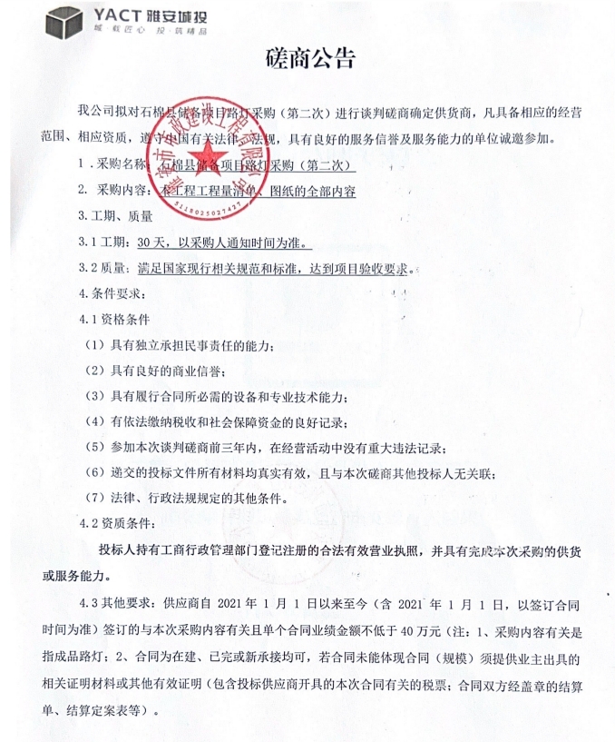 石棉縣儲(chǔ)備項(xiàng)目路燈采購(第二次)磋商公告