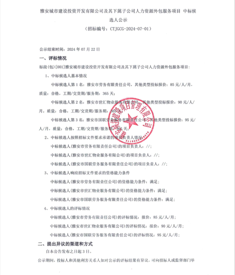 雅安城市建設(shè)投資開發(fā)有限公司及其下屬子公司人力資源外包服務(wù)項目中標(biāo)候選人公示
