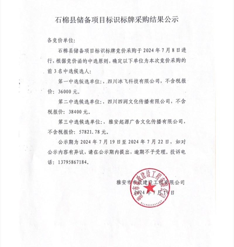 石棉縣儲(chǔ)備項(xiàng)目標(biāo)識(shí)標(biāo)牌采購(gòu)結(jié)果公示