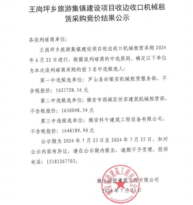 王崗坪鄉(xiāng)旅游集鎮(zhèn)建設項目收邊收口機械租賃采購競價結(jié)果公示