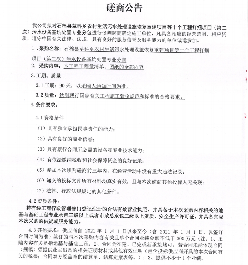 石棉縣草科鄉(xiāng)農(nóng)村生活污水處理設(shè)施恢復(fù)重建項目等十個工程打捆項目(第二次) 污水設(shè)備基坑處置專業(yè)分包采購談判磋商公告
