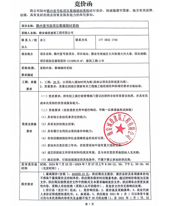 雅州壹號(hào)院項(xiàng)目幕墻輔材采購(gòu)競(jìng)價(jià)公告