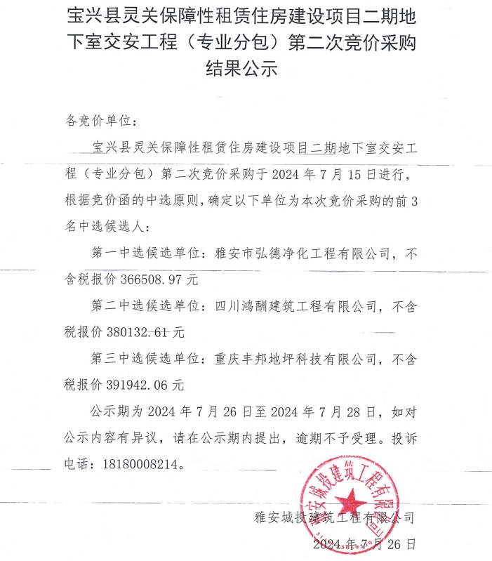 寶興縣靈關(guān)保障性租賃住房建設(shè)(二期)地下交安工程(專業(yè)分包)第二次競價(jià)采購結(jié)果公示