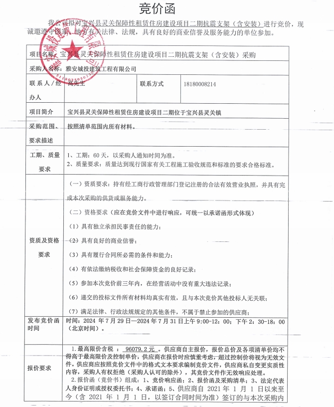 寶興縣靈關(guān)保障性租賃住房建設(shè)項(xiàng)目二期抗震支架(含安裝)采購競(jìng)價(jià)公告