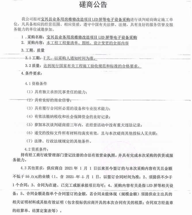 寶興縣業(yè)務用房維修改造項目LED屏等電子設備采購磋商公告