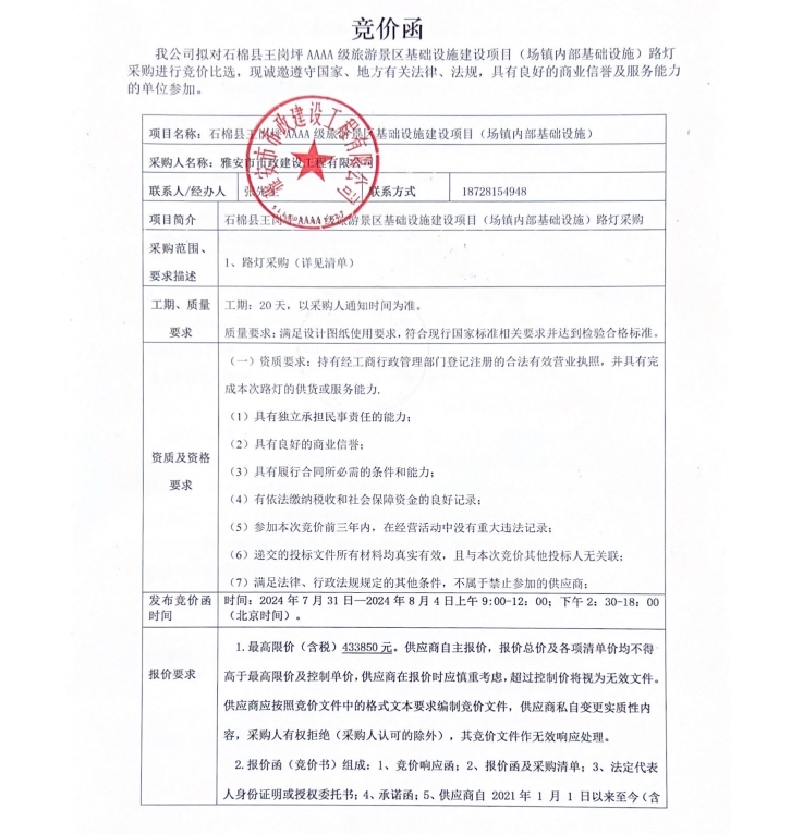 石棉縣王崗坪AAAA級(jí)旅游景區(qū)基礎(chǔ)設(shè)施建設(shè)項(xiàng)目(場(chǎng)鎮(zhèn)內(nèi)部基礎(chǔ)設(shè)施)路燈采購競(jìng)價(jià)公告
