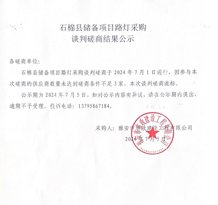 石棉縣儲(chǔ)備項(xiàng)目路燈采購談判磋商結(jié)果公示