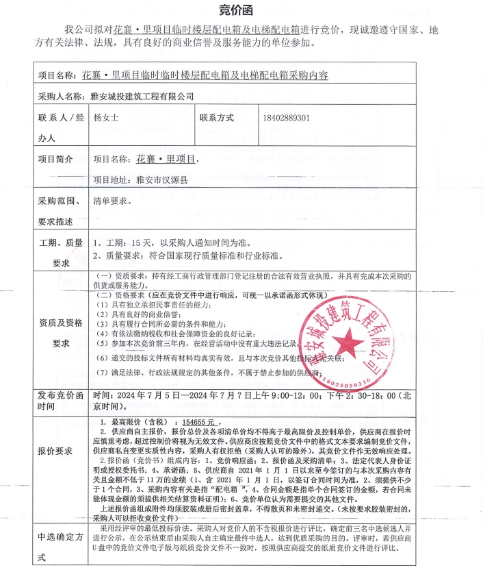 花襄·里項(xiàng)目臨時(shí)樓層配電箱及電梯配電箱競(jìng)價(jià)公告