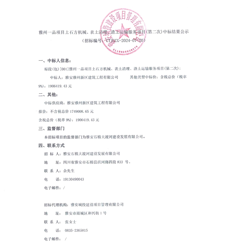 雅州一品項(xiàng)目土石方機(jī)械、表土清理、渣土運(yùn)輸服務(wù)項(xiàng)目(第二次)中標(biāo)結(jié)果公示
