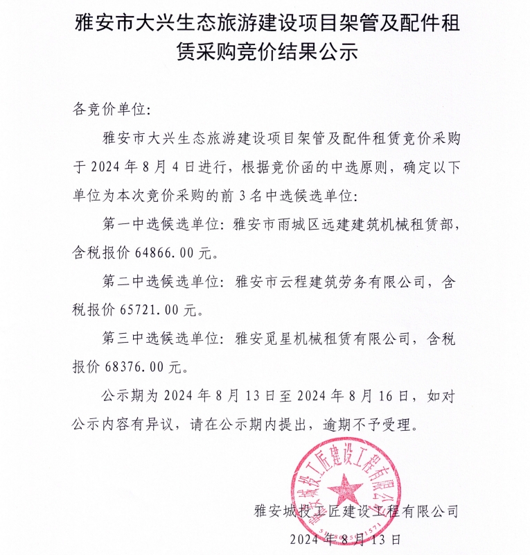 雅安市大興生態(tài)旅游建設(shè)項(xiàng)目架管及配件租賃采購競價結(jié)果公示