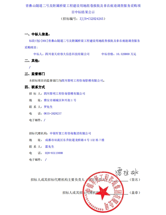 青鼻山隧道二號及附屬橋梁工程建設(shè)用地組卷報批及非農(nóng)痕跡調(diào)查服務(wù)采購項(xiàng)目中標(biāo)結(jié)果公示
