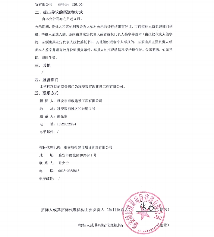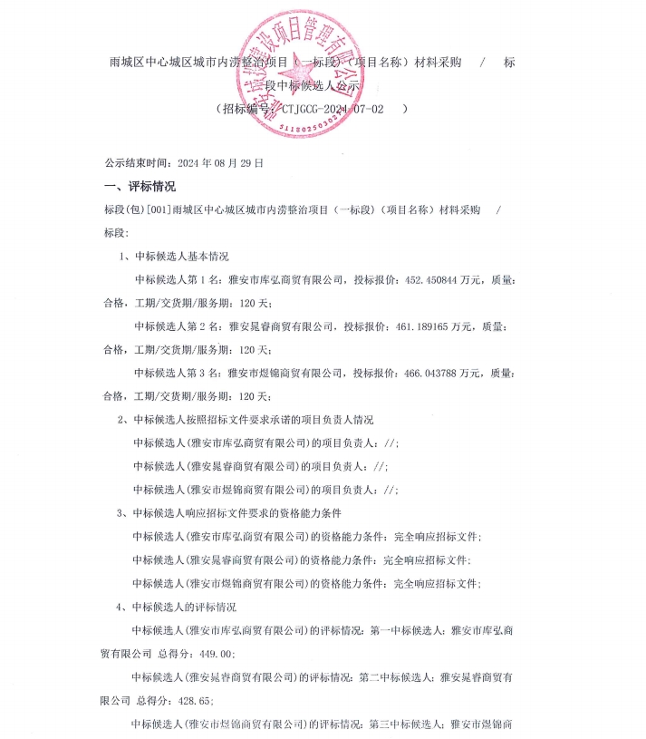 雨城區(qū)中心城區(qū)城市內(nèi)澇整治項目(一標段)(項目名稱)材料采購/標段中標候選人公示