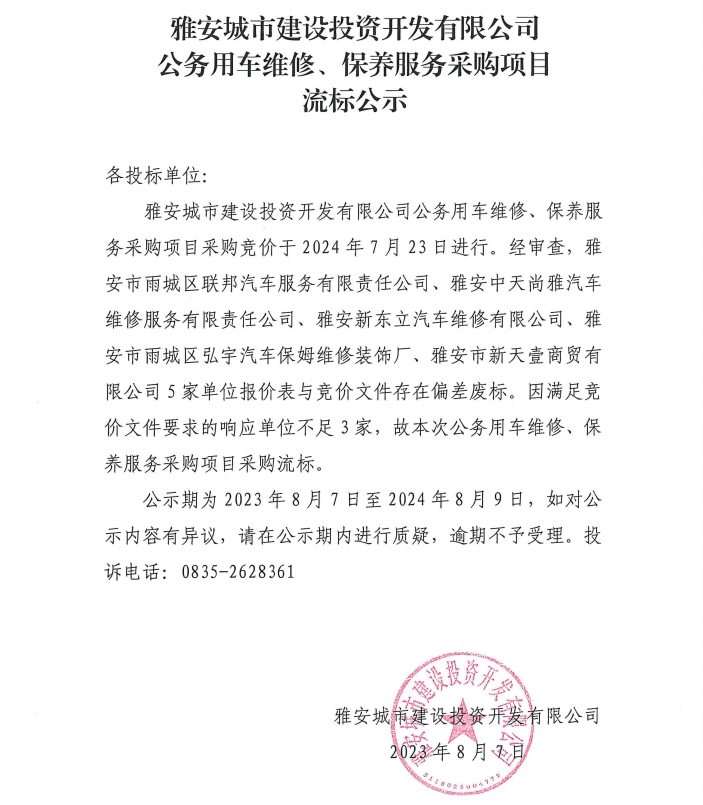雅安城市建設(shè)投資開(kāi)發(fā)有限公司公務(wù)用車維修、保養(yǎng)服務(wù)采購(gòu)項(xiàng)目流標(biāo)公示
