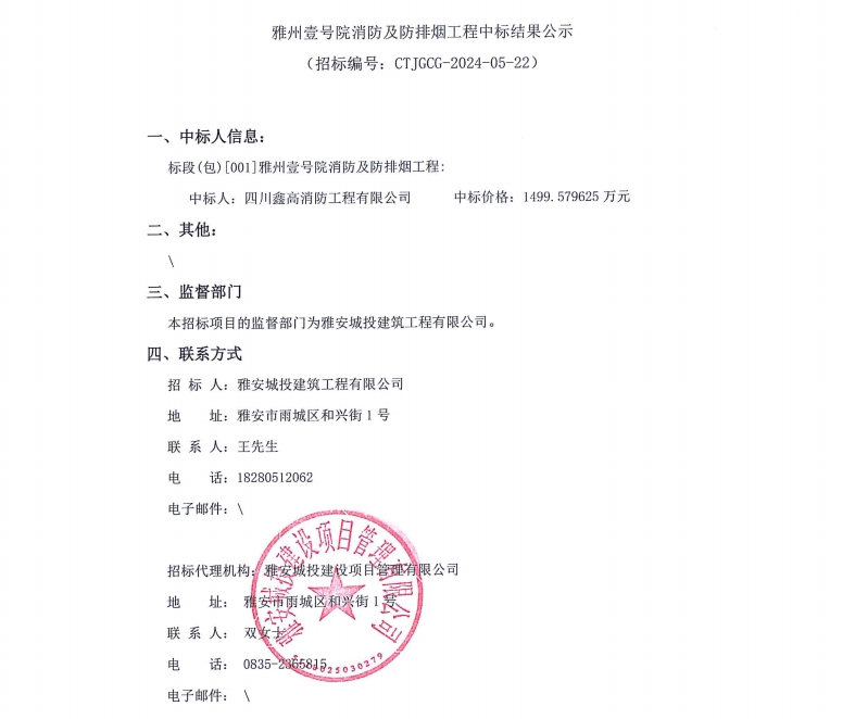 雅州壹號院消防及防排煙工程中標結(jié)果公示