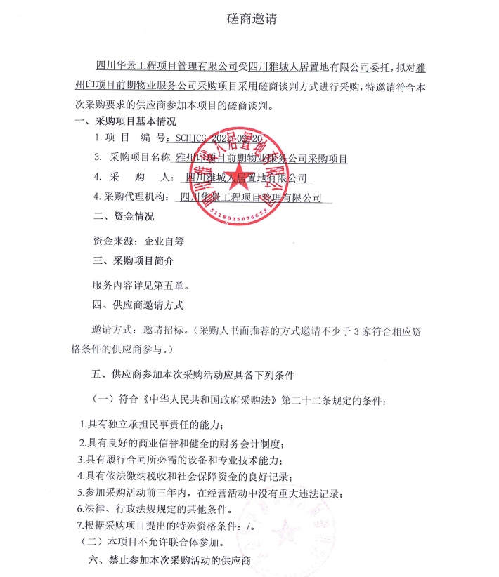 雅州印項(xiàng)目前期物業(yè)服務(wù)公司采購項(xiàng)目磋商邀請(qǐng)