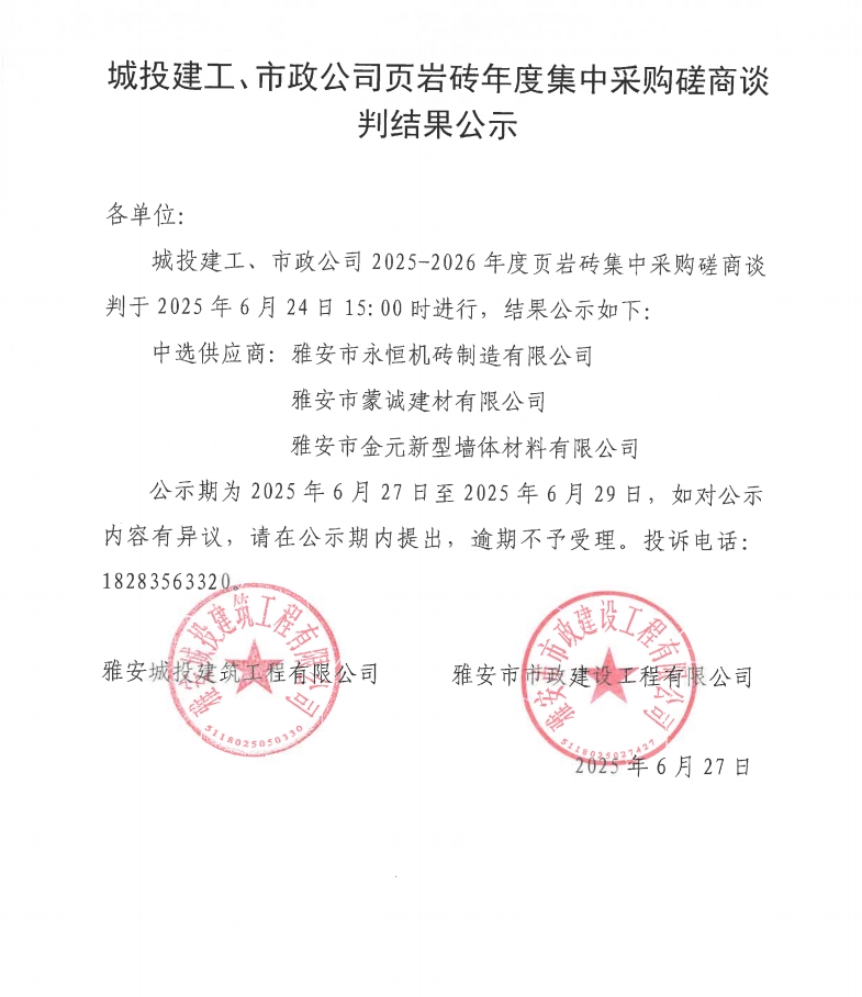 城投建工、市政公司頁(yè)巖磚年度集中采購(gòu)磋商談判結(jié)果公示