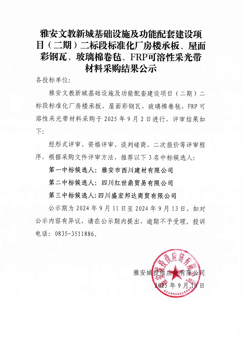 雅安文教新城基礎(chǔ)設(shè)施及功能配套建設(shè)項目(二期)二標(biāo)段標(biāo)準(zhǔn)化廠房樓承板、屋面彩鋼瓦、玻璃棉卷氈、FRP可溶性采光帶材料采購結(jié)果公示