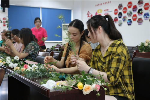 員工們緊盯花藝師邊學(xué)邊練,花枝高低錯落、疏密有致、虛實結(jié)合……,現(xiàn)場氣氛非;钴S,一個個插花技巧華麗集合。經(jīng)過2小時的精心制作,一束束鮮花逐漸形成,大家看著自己的作品,充滿了成就感和喜悅感。
