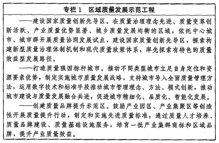 (九)打造區(qū)域質量發(fā)展新優(yōu)勢。加強質量政策引導,推動區(qū)域質量發(fā)展與生產力布局、區(qū)位優(yōu)勢、環(huán)境承載能力及社會發(fā)展需求對接融合。推動東部地區(qū)發(fā)揮質量變革創(chuàng)新的引領帶動作用,增強質量競爭新優(yōu)勢,實現(xiàn)整體質量提升。引導中西部地區(qū)因地制宜發(fā)展特色產業(yè),促進區(qū)域內支柱產業(yè)質量升級,培育形成質量發(fā)展比較優(yōu)勢。推動東北地區(qū)優(yōu)化質量發(fā)展環(huán)境,加快新舊動能轉換,促進產業(yè)改造升級和質量振興。健全區(qū)域質量合作互助機制,推動區(qū)域質量協(xié)同發(fā)展。深化質量強省建設,推動質量強市、質量強業(yè)向縱深發(fā)展,打造質量強國建設標桿。